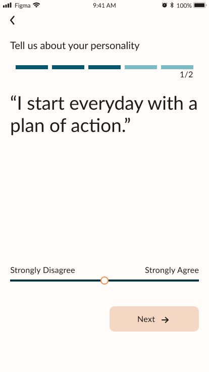 User Testing not only influenced how the app looked but also how the overall solution functioned. Initially career paths or jobs would be tagged with certain characteristics and based on the responses of a user they would receive recommendations for careers that featured tags that reflected their answers. However user testing showed that the responses should not be binary. From a visual perspective it meant a slider that allowed a user to show just how much they agreed with a personality.